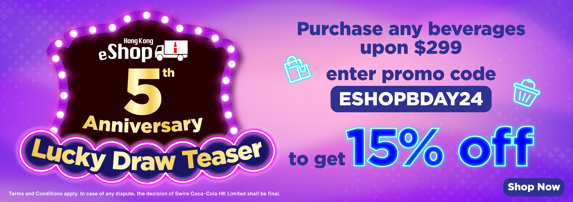eShop customers who successfully purchase upon $299 at Swire “Coca-Cola” HK eShop ( https://www.swirecocacolahk.com/ ) from 10:00 on 13th August 2024 to 23:59 on 1st September 2024 ^* enter discount code [ESHOPBDAY24] to get 15% off. Stay tuned for our 5th Anniversary Lucky Draw on 2nd September 2024!