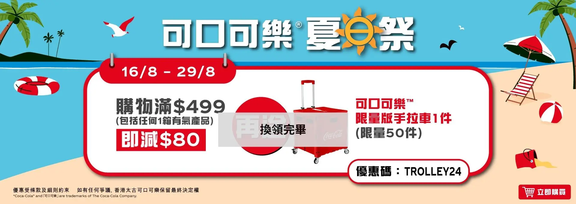 網店客戶由2024年8月16日10:00至8月29日23:59活動期間,在香港太古「可口可樂」eShop(https://www.swirecocacolahk.com/)成功購物任何產品滿$499 (包括任何1箱24罐/24樽有氣飲料)^*,輸入優惠碼【TROLLEY24】全單即減$80再送您可口可樂™ 限量版1件,名額50個,先到先得, 送完即止#。