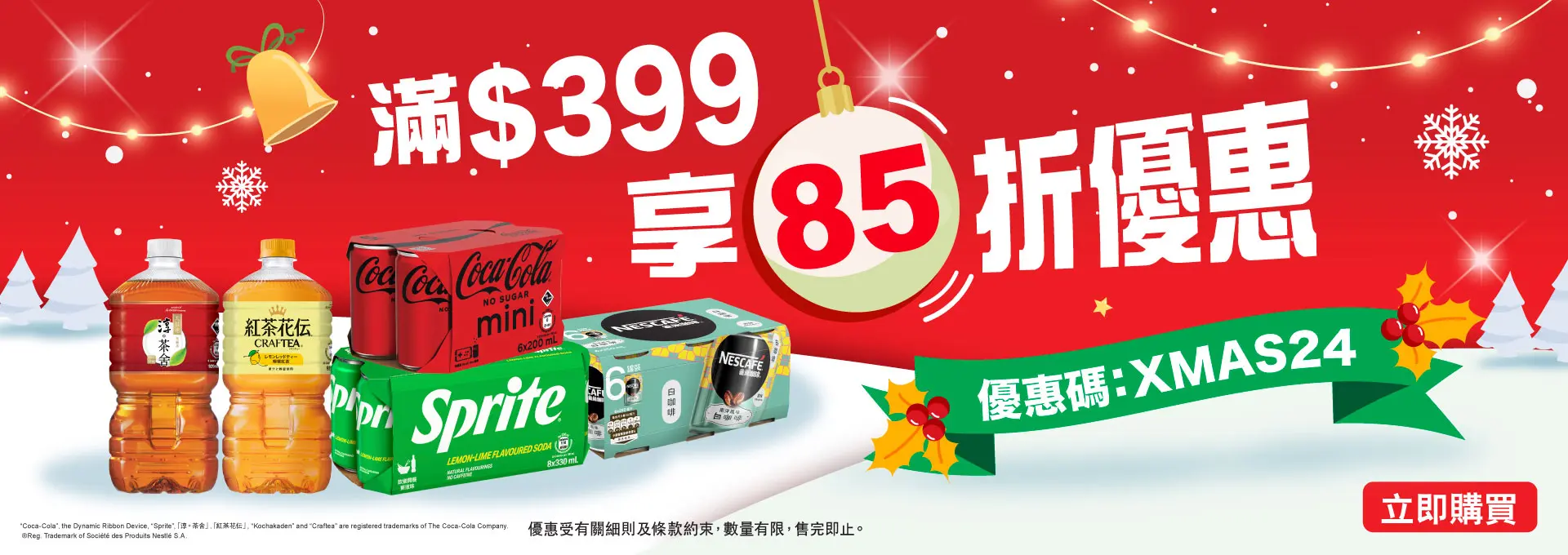 網店客戶由2024年12月2日00:00至12月22日23:59活動期間,在香港太古「可口可樂」eShop(https://www.swirecocacolahk.com/)成功購物任何產品滿$399 ^*,輸入優惠碼【XMAS24】全單即享85折。