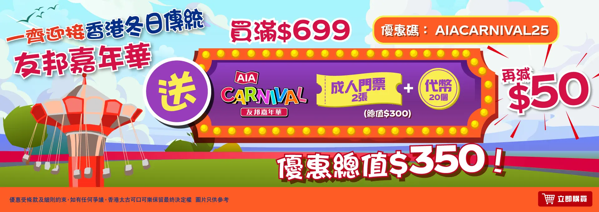 網店客戶由2025年12月17日00:00至2026年2月13日23:59活動期間,在香港太古「可口可樂」eShop(https://www.swirecocacolahk.com/)成功購物滿$699^*,輸入優惠碼【AIACARNIVAL25】全單即減$50再送(非高峰/普通日子AIA友邦嘉年華成人門票及10枚代幣)x 2套(價值$300)。名額80個,先到先得, 送完即止#。