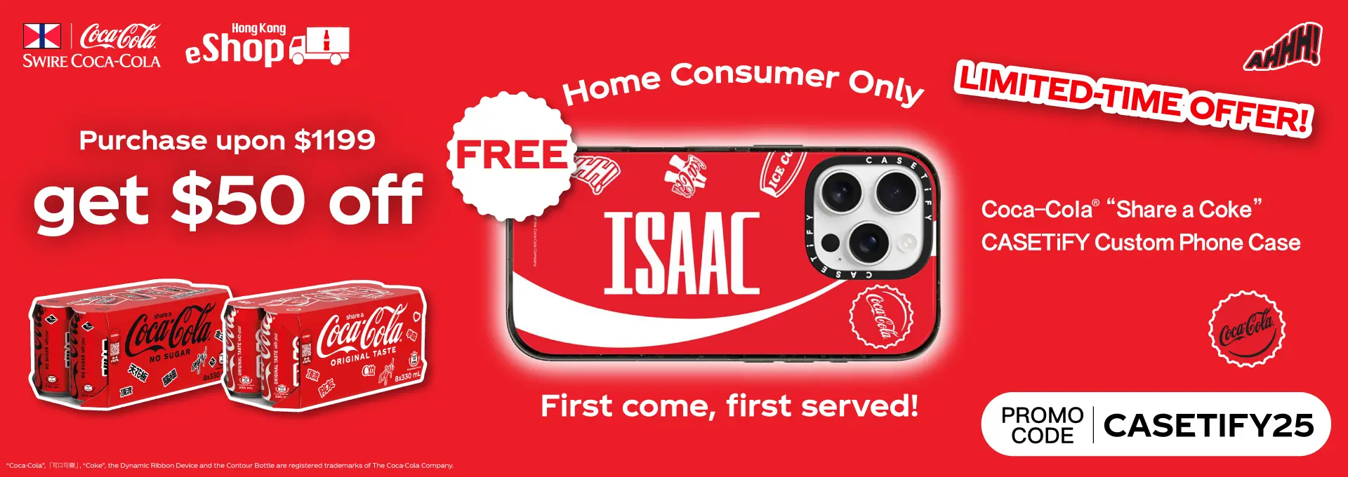 eShop customers who successfully purchase any product upon $1,199** at Swire “Coca-Cola” HK eShop ( https://www.swirecocacolahk.com/ ) from 00:00 on 4th November 2025 to 23:59 on 28th November 2025 ^* enter discount code [CASETIFY25] to get $50 off, and get a free Coca-Cola™ Share A Coke CASETiFY Custom Case x 1pc. The quota is limited (100 sets), first come first served, while stocks last#.