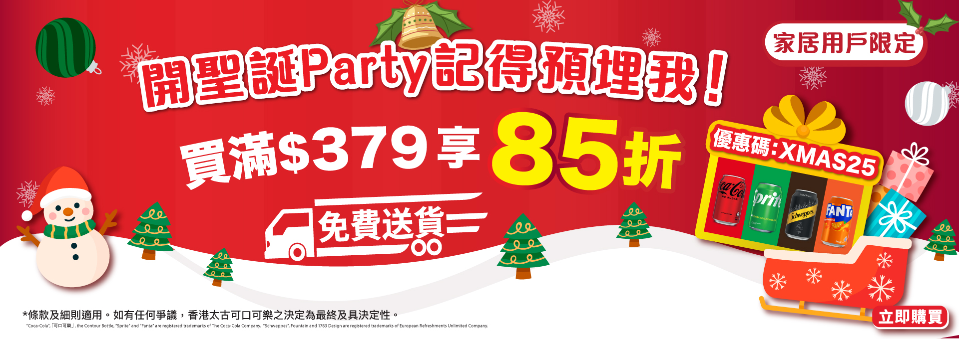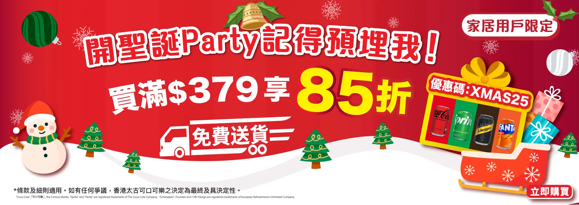 網店客戶由2025年12月1日00:00至12月26日23:59活動期間,在香港太古「可口可樂」eShop(https://www.swirecocacolahk.com/)成功購物滿$379^*,輸入優惠碼【XMAS25】全單即享85折。