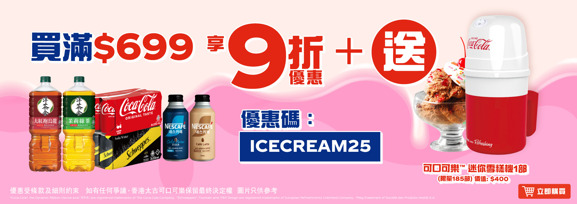 網店客戶由2025年6月16日00:00至7月23日23:59活動期間,在香港太古「可口可樂」eShop(https://www.swirecocacolahk.com/)成功購物滿$699^*,輸入優惠碼【ICECREAM25】全單即享9折優惠再送可口可樂™迷你雪糕機1件**。名額185個,先到先得, 送完即止#。