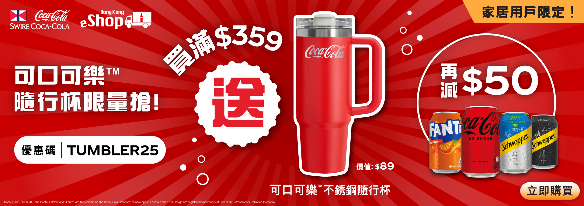 網店客戶由2025年11月17日00:00至12月12日23:59活動期間,在香港太古「可口可樂」eShop(https://www.swirecocacolahk.com/)成功購物滿$359^*,輸入優惠碼【TUMBLER25】全單即減$50再送可口可樂™不銹鋼隨行杯 30安士 x 1個。名額190個,先到先得, 送完即止#。