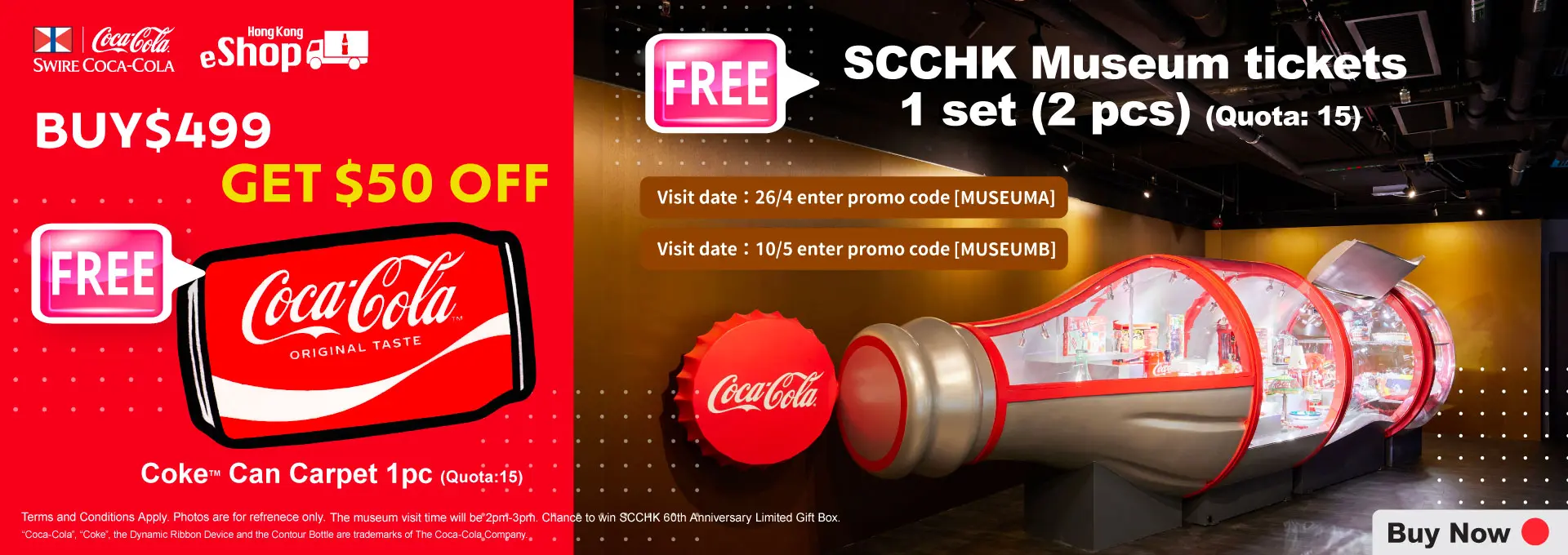 eShop customers who successfully purchase any product upon $499** at Swire “Coca-Cola” HK eShop ( https://www.swirecocacolahk.com/ ) from 15:00 on 25th March 2025 to 23:59 on 14th April 2025 ^* enter designated promo code to get $50 off, free a Coca-Cola™ Can Carpet x 1pc and SCCHK Museum Tickets 1 set (2pcs). Please enter the promo code corresponding to the visit date. Once the order is confirmed and successfully delivered, it cannot be changed.