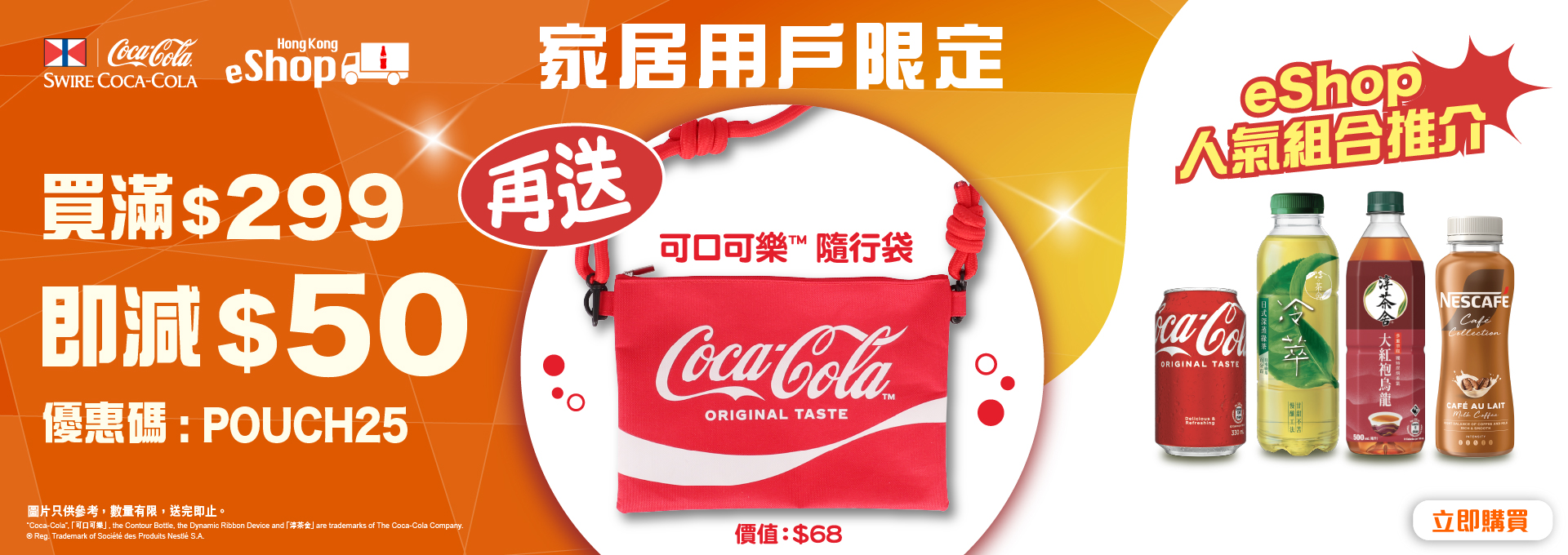 網店客戶由2025年10月27日00:00至11月21日23:59活動期間,在香港太古「可口可樂」eShop(https://www.swirecocacolahk.com/)成功購物滿$299^*,輸入優惠碼【POUCH25】全單即減$50再送可口可樂™隨行袋 x 1個。名額190個,先到先得, 送完即止#。