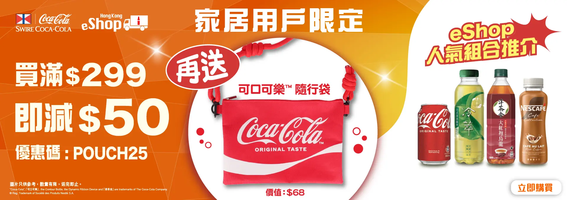 網店客戶由2025年10月27日00:00至11月30日23:59活動期間,在香港太古「可口可樂」eShop(https://www.swirecocacolahk.com/)成功購物滿$299^*,輸入優惠碼【POUCH25】全單即減$50再送可口可樂™隨行袋 x 1個。名額190個,先到先得, 送完即止#。