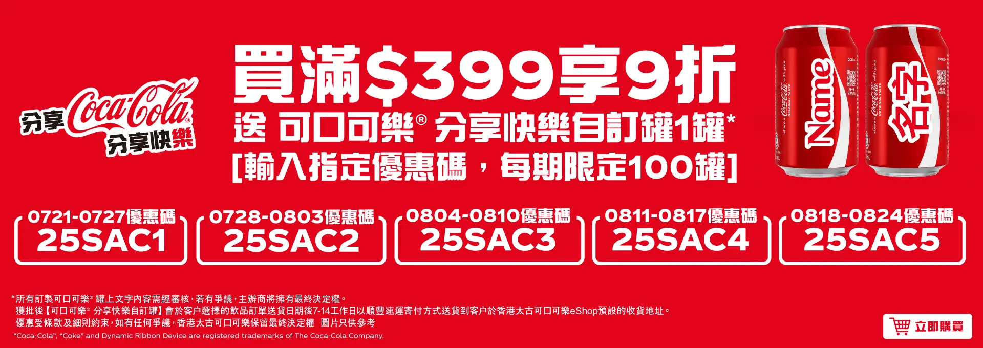 網店客戶由2025年7月21日00:00至8月24日23:59活動期間,在香港太古「可口可樂」eShop(https://www.swirecocacolahk.com/)成功購物滿$399^*,輸入指定優惠碼(請輸入優惠期間指定優惠碼)全單即享9折優惠,再送你【可口可樂®️分享快樂自訂罐】1個**。名額每星期100個,先到先得,送完即止#。