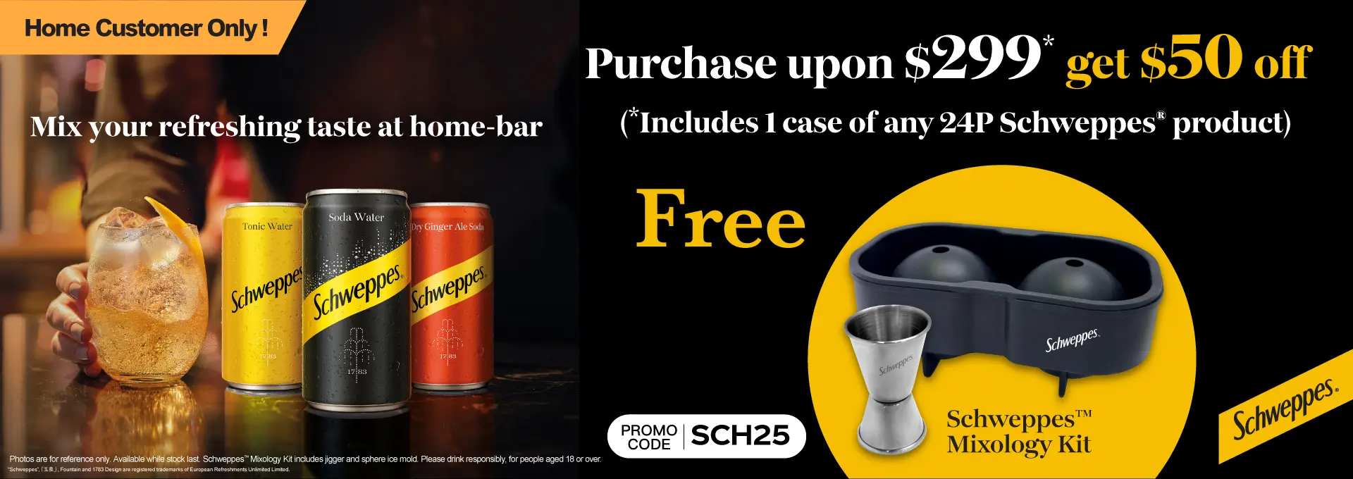 eShop customers who successfully purchase any product upon $299 (Includes 1 case of any 24P Schweppes product) ( at Swire “Coca-Cola” HK eShop ( https://www.swirecocacolahk.com/ ) from 00:00 on 18th December 2025 to 23:59 on 28th February 2026 ^* enter discount code [SCH25] to get $50 off and a free Schweppes™ Mixology Kit x 1 pc. The quota is limited (120 sets), first come first served, while stocks last#.
