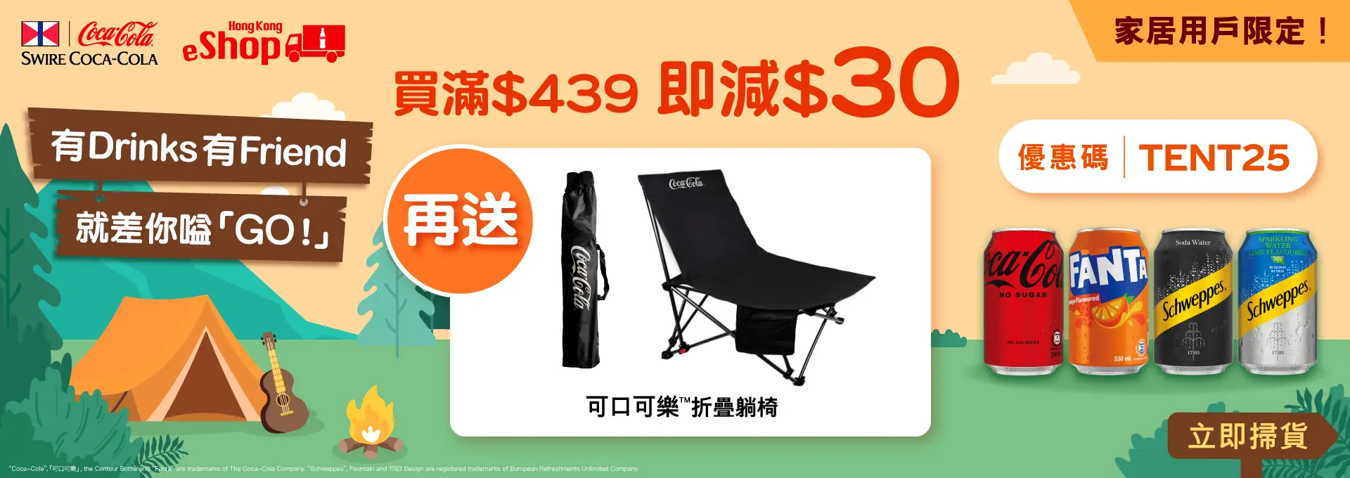網店客戶由2025年11月4日00:00至11月21日23:59活動期間,在香港太古「可口可樂」eShop(https://www.swirecocacolahk.com/)成功購物滿$439^*,輸入優惠碼【TENT25】全單即減$30再送可口可樂™折疊躺椅 x 1個。名額90個,先到先得, 送完即止#。