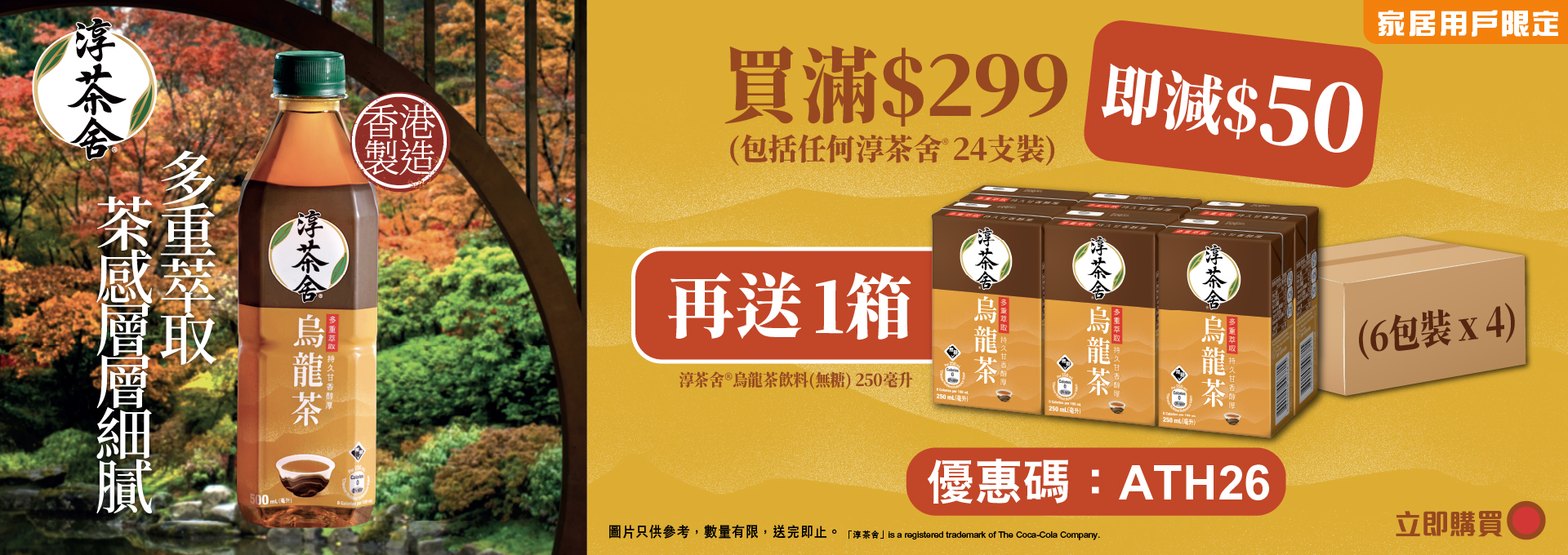 網店客戶由2026年3月2日00:00至2026年4月3日23:59活動期間,在香港太古「可口可樂」eShop(https://www.swirecocacolahk.com/)成功購物滿$299(需包括任何淳茶舍1箱24支裝產品)^*,輸入優惠碼【ATH26】全單即減$50再送1箱24包裝淳茶舍®烏龍茶飲料(無糖)250毫升。名額100個,先到先得, 送完即止#。