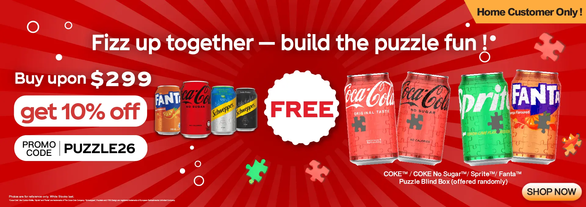 eShop customers who successfully purchase upon $299 at Swire “Coca-Cola” HK eShop ( https://www.swirecocacolahk.com/ ) from 00:00 on 2nd March 2026 to 23:59 on 31st March 2026 ^* enter discount code [PUZZLE26] to get 10% off and COKE™ / COKE No Sugar™/ Sprite™/ Fanta™ Puzzle Blind Box (offered randomly) x 1pc. The quota is limited (300 sets), first come first served, while stocks last#.