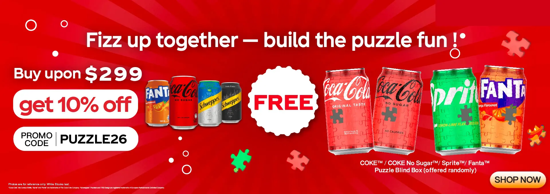 eShop customers who successfully purchase upon $299 at Swire “Coca-Cola” HK eShop ( https://www.swirecocacolahk.com/ ) from 00:00 on 2nd March 2026 to 23:59 on 5th April 2026 ^* enter discount code [PUZZLE26] to get 10% off and COKE™ / COKE No Sugar™/ Sprite™/ Fanta™ Puzzle Blind Box (offered randomly) x 1pc. The quota is limited (300 sets), first come first served, while stocks last#.