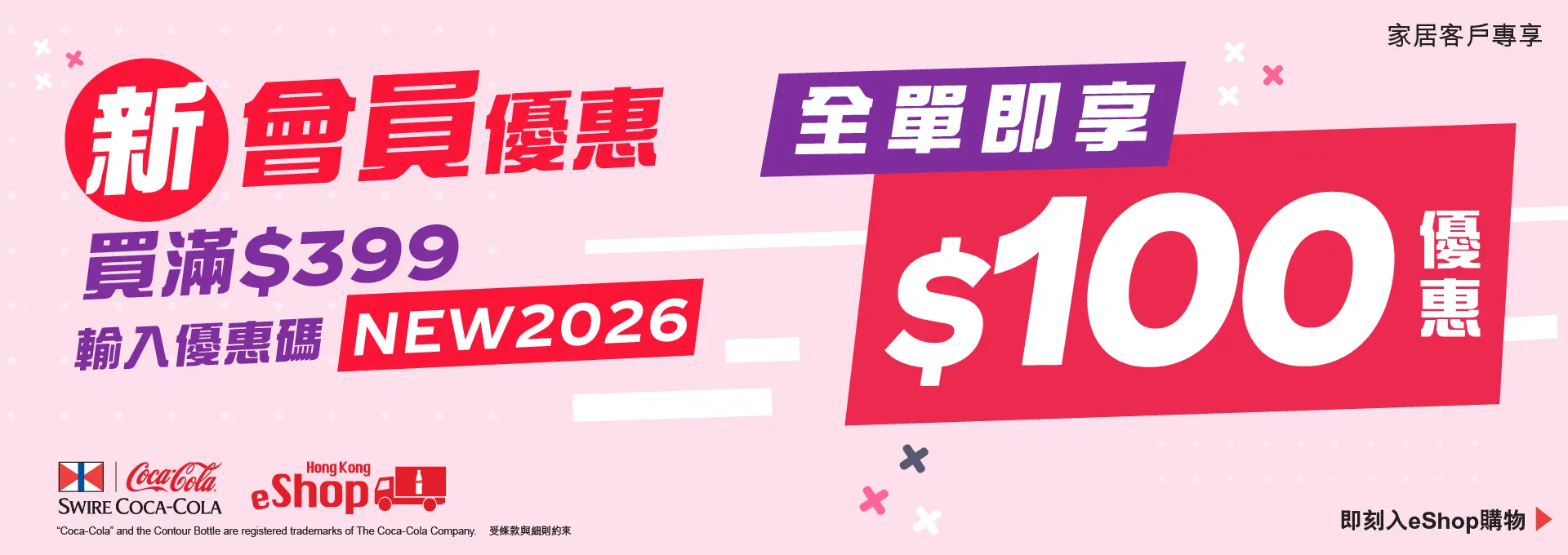 新家居網店客戶由2026年1月1日00:00至12月31日23:59活動期間,在香港太古「可口可樂」eShop(https://www.swirecocacolahk.com/)成功購物任何產品滿$399^*,輸入優惠碼【NEW2026】即享全單$100折扣優惠。