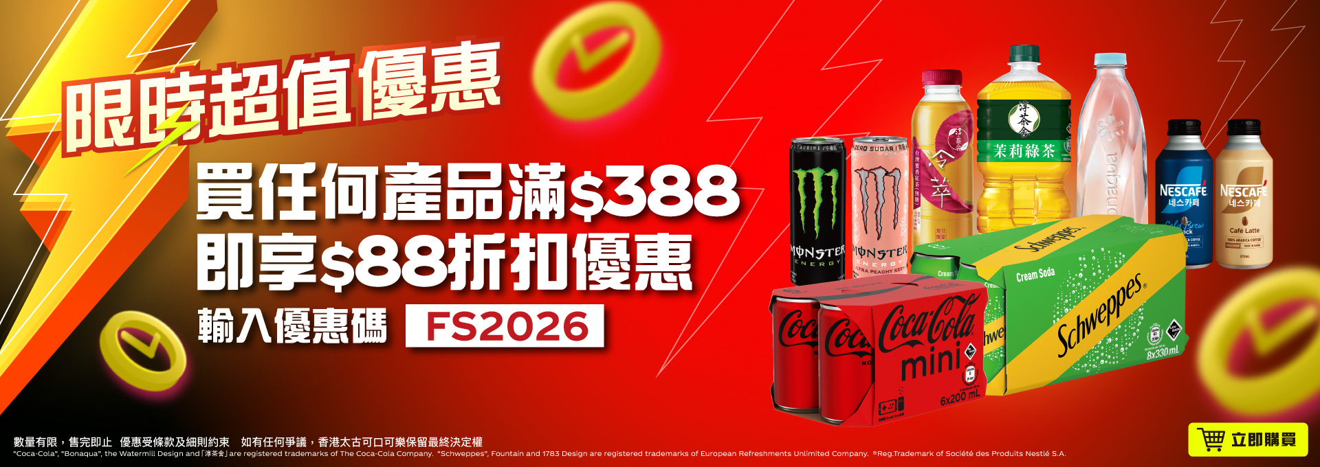 網店客戶由2026年1月13日00:00至1月14日23:59活動期間,在香港太古「可口可樂」eShop(https://www.swirecocacolahk.com/)成功購買任何產品滿$388^*,輸入優惠碼【FS2026】即享全單$88折扣優惠。