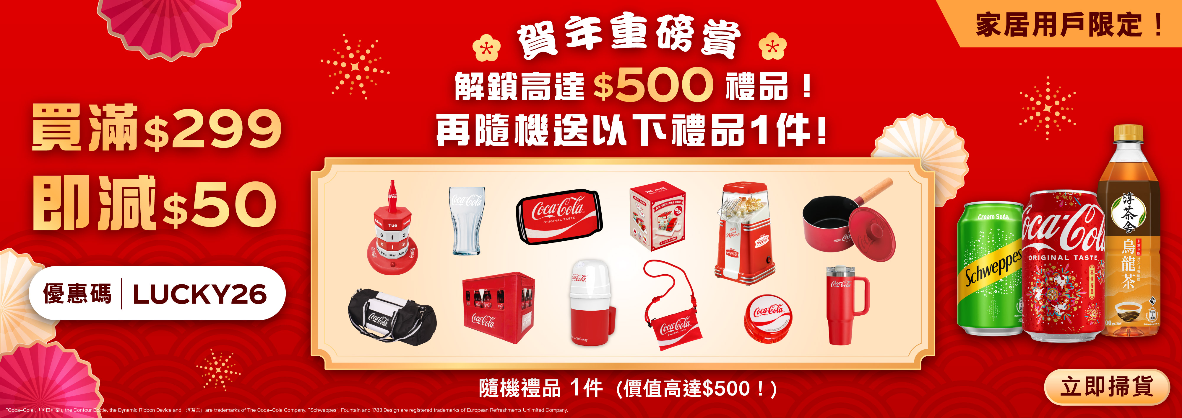 網店客戶由2026年1月19日00:00至2026年2月20日23:59活動期間,在香港太古「可口可樂」eShop(https://www.swirecocacolahk.com/)成功購物滿$299^*,輸入優惠碼【LUCKY26】全單即減$50再送隨機禮品1件。名額300個,先到先得, 送完即止#。