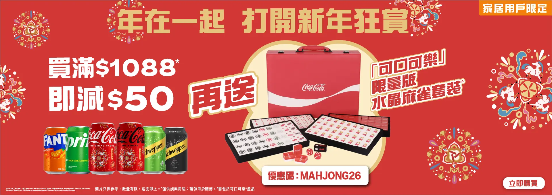 網店客戶由2026年2月11日00:00至2026年2月27日23:59活動期間,在香港太古「可口可樂」eShop(https://www.swirecocacolahk.com/)成功購物滿$1088(需包括可口可樂®產品)^*,輸入優惠碼【MAHJONG26】全單即減$50再送「可口可樂」限量版水晶麻雀套裝 x 1件。名額100個,先到先得, 送完即止#。