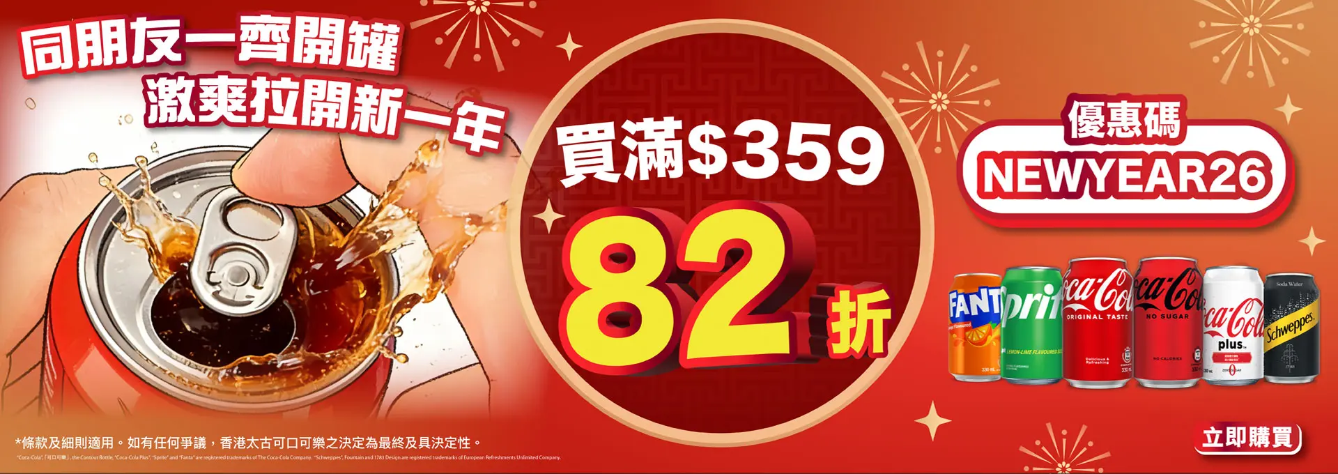 網店客戶由2026年1月5日00:00至1月18日23:59活動期間,在香港太古「可口可樂」eShop(https://www.swirecocacolahk.com/)成功購物滿$359^*,輸入優惠碼【NEWYEAR26】全單即享82折。
