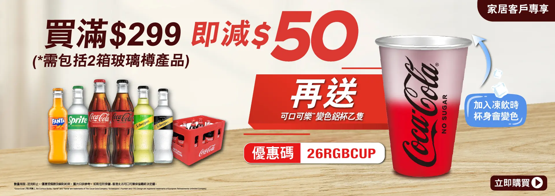 網店客戶由2026年1月1日00:00至12月31日23:59活動期間,在香港太古「可口可樂」eShop(https://www.swirecocacolahk.com/)成功買滿$299 (需包括2箱玻璃樽產品)^*,輸入優惠碼[26RGBCUP]全單即減$50優惠,再送你可口可樂™變色杯1個**。名額200個,先到先得,送完即止#。