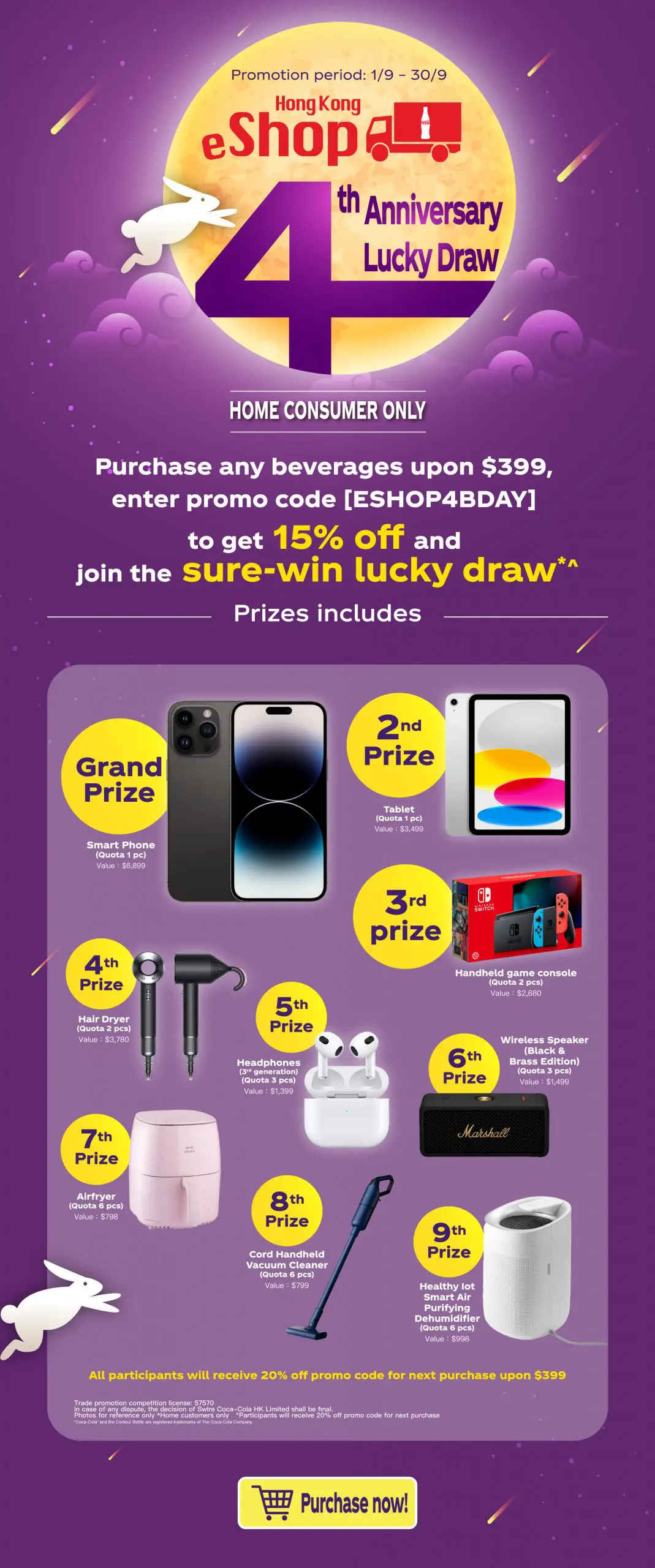 - From 1 to 30 Sep 2023, buy any products at Swire Coca-Cola HK eShop (https://www.swirecocacolahk.com/) at $399 or above, in a single transaction and before using any promo code, enter promo code [ESHOP4BDAY] can enjoy 15% off discount, Prize for Participation: Swire Coca-Cola HK eShop 20% off Discount Code for next purchase (The promotion code will be shared via email after the delivery of the order is completed) and automatically participate in the lucky draw.