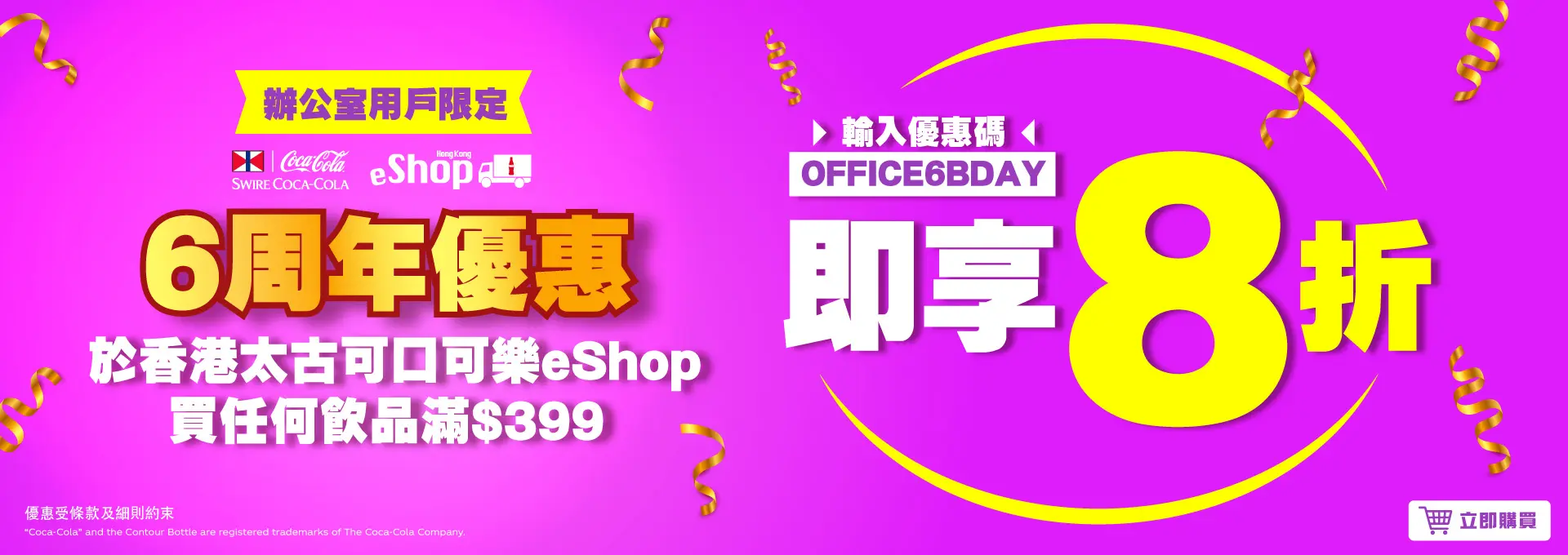 由即日起至2025年9月26日23:59期間,辦公室客戶於香港太古可口可樂eShop(https://www.swirecocacolahk.com/) 購買任何產品滿$399(以單一交易及使用折扣優惠碼前計算),輸入優惠碼【OFFICE6BDAY】即可享有8折。