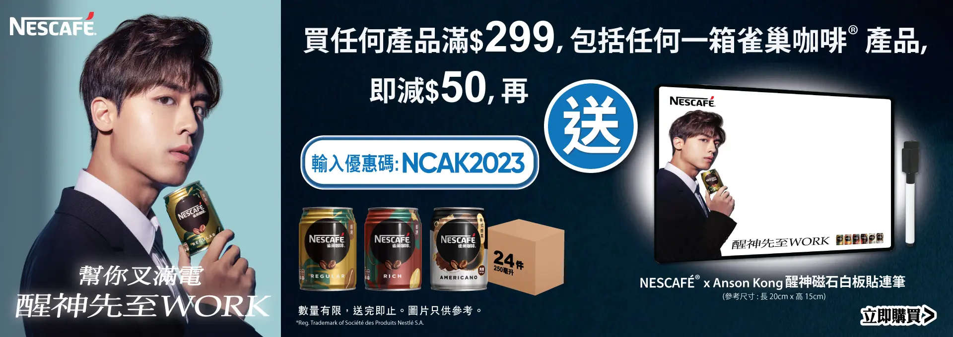 網店客戶由2023年6月7日10:00至6月27日23:59活動期間,在香港太古可口可樂 eShop(https://www.swirecocacolahk.com/)成功購物滿$299^* 或以上,其中包括任何一箱雀巢咖啡產品,並輸入推廣碼【NCAK2023】,即享 $50折扣及免費 ”NESCAFÉ®️ X Anson Kong 醒神磁石白板貼連筆” 一份,名額400套,先到先得, 送完即止#。
