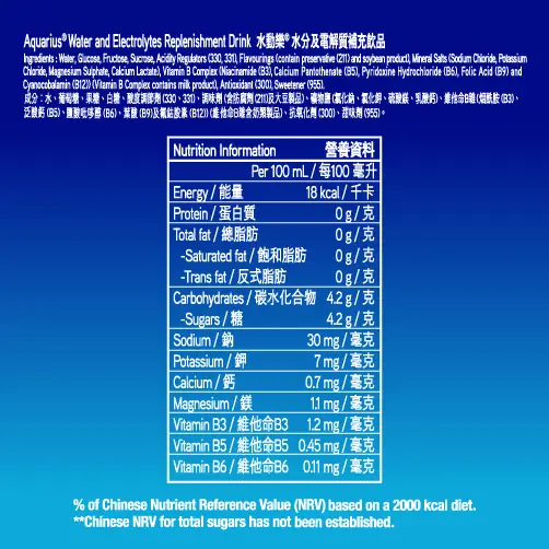 Aquarius® contains vitamin B complex, helps you to reduce fatigue. Effectively replenish water & electroyltes that you lost in perspiration . Low Sugar and Low Calories
