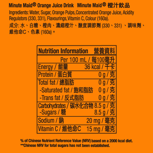 Minute Maid ® Orange Pulpy tastes so refreshing with rich orange pulps and with every sip of good orange taste. Orange juice and pulps come from good orange origin, the Americas. Made in Hong Kong. A must-choose for its credibility! It is also rich in Vitamin C!