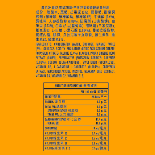 A crazy mango flavored energy drink, made with 16% real fruit juices. It is a heavenly blend of exotic juices certain to attract then the most stubborn spirit.