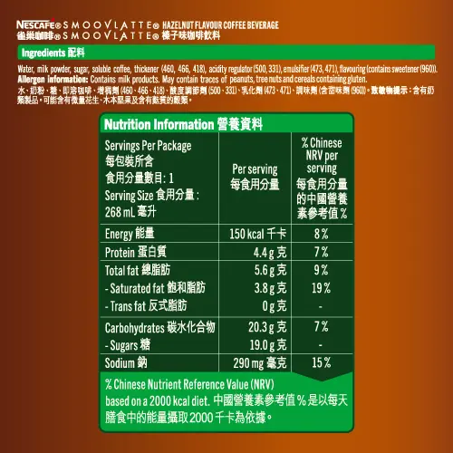 The brand new NESCAFÉ® SMOOVLATTÉ® Hazelnut flavor coffee beverage is made from a special blend of coffee beans, together with the pleasant hazelnut aroma. You can taste every sip of the coffee with smoothness which brings you a new enjoyment!