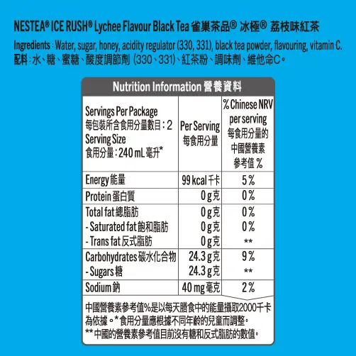 濃郁的紅茶為基調,帶有香甜荔枝風味, 完美結合荔枝風味及濃郁紅茶, 清爽香甜、順口怡人, 配合透心涼的獨特冰極口感,帶來多層次的清新解渴體驗。NESTEA® 為香港人熟悉品牌,香港製造信心保證