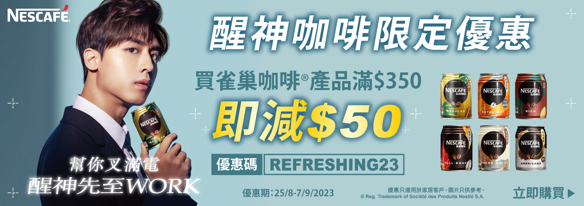 網店客戶由2023年8月25日10:00至9月7日23:59活動期間,在香港太古「可口可樂」eShop(https://www.swirecocacolahk.com/)成功購物雀巢咖啡®產品滿$350^* 或以上,並輸入推廣碼【REFRESHING23】,雀巢咖啡®產品即減 $50。