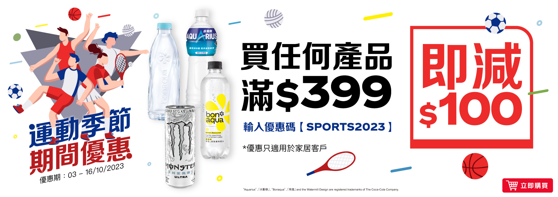 網店客戶由2023年10月03日10:00至10月16日23:59活動期間,在香港太古「可口可樂」eShop(https://www.swirecocacolahk.com/)成功購物任何產品滿$399^* 或以上,並輸入推廣碼【SPORTS2023】,即減$100。