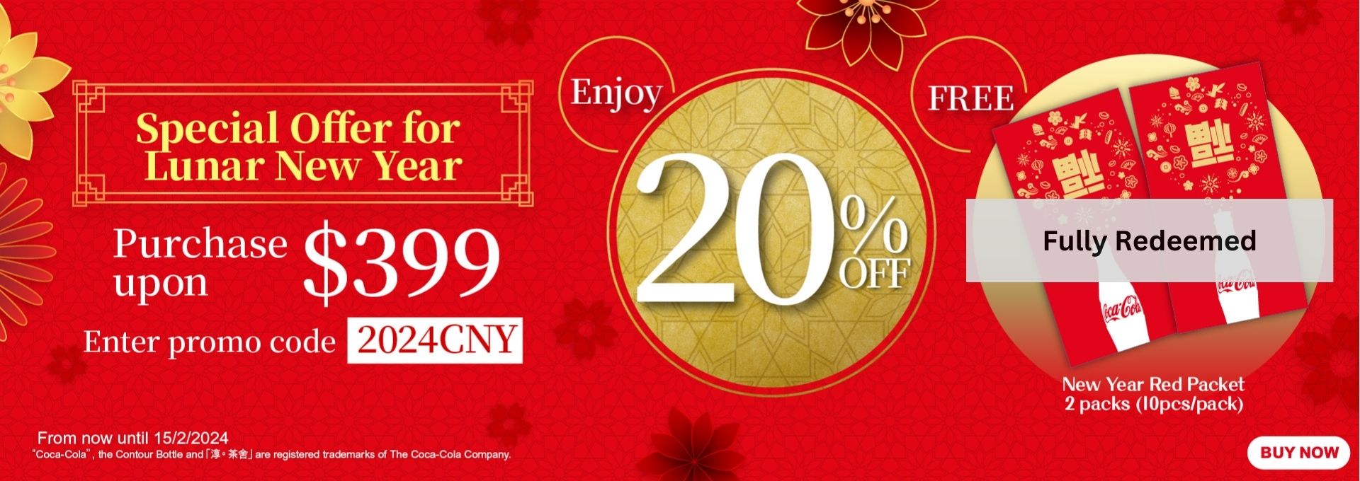 eShop customers who successfully purchase any product upon $399 at Swire “Coca-Cola” HK eShop ( https://www.swirecocacolahk.com/ ) from 10:00 on January 18, 2024 to 23:59 on February 15, 2024 ^* enter discount code [2024CNY] to get 20% off and 2 packs of New Year Red Packets (300 Quota).